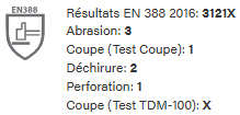 Abrasion: 3 Coupe (Test Coupe): 1 Déchirure: 2 Perforation: 1 Coupe (Test TDM-100): X